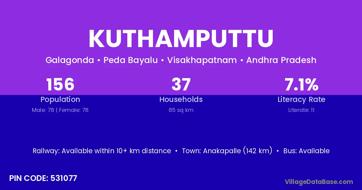 Anakapalle (142 km) is the nearest town to Kuthamputtu village for major economic activities and is located approximately 142 km away.