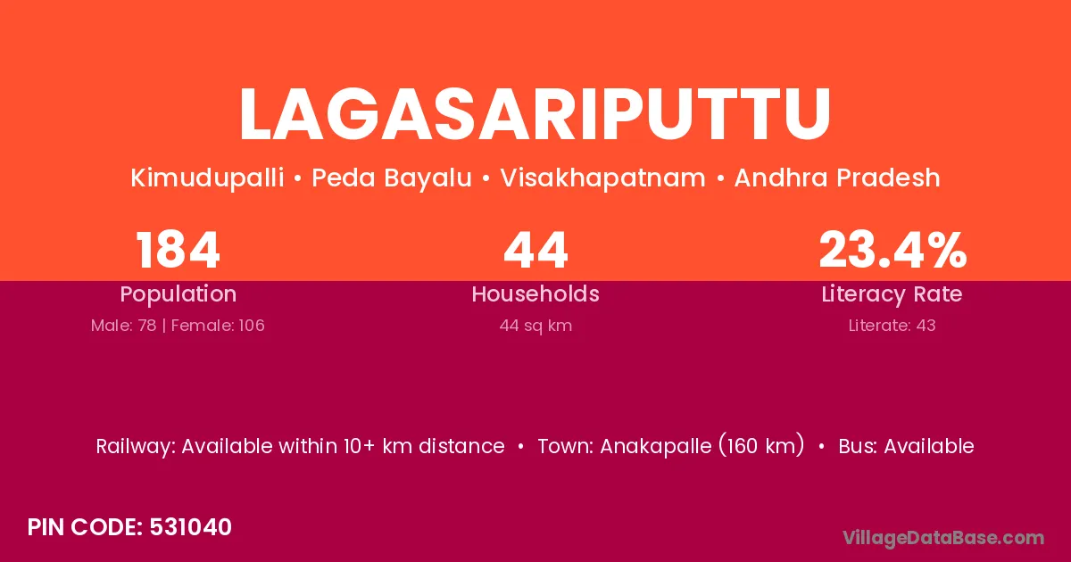 Lagasariputtu village has a total population of 184 people, of which 78 are males and 106 are females.