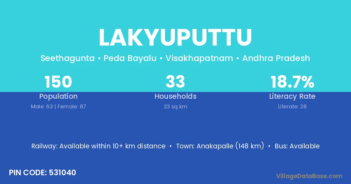 Anakapalle (148 km) is the nearest town to Lakyuputtu village for major economic activities and is located approximately 148 km away.