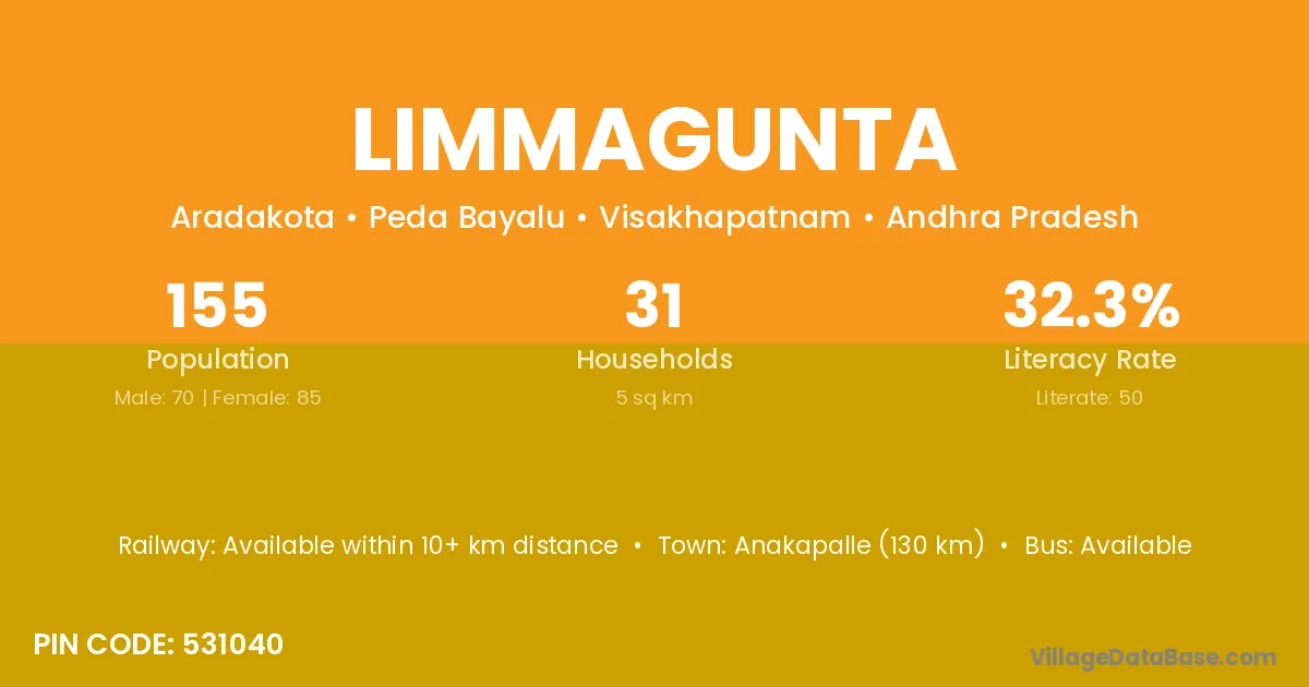 Anakapalle (130 km) is the nearest town to Limmagunta village for major economic activities and is located approximately 130 km away.