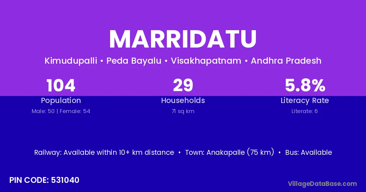 Anakapalle (75 km) is the nearest town to Marridatu village for major economic activities and is located approximately 75 km away.