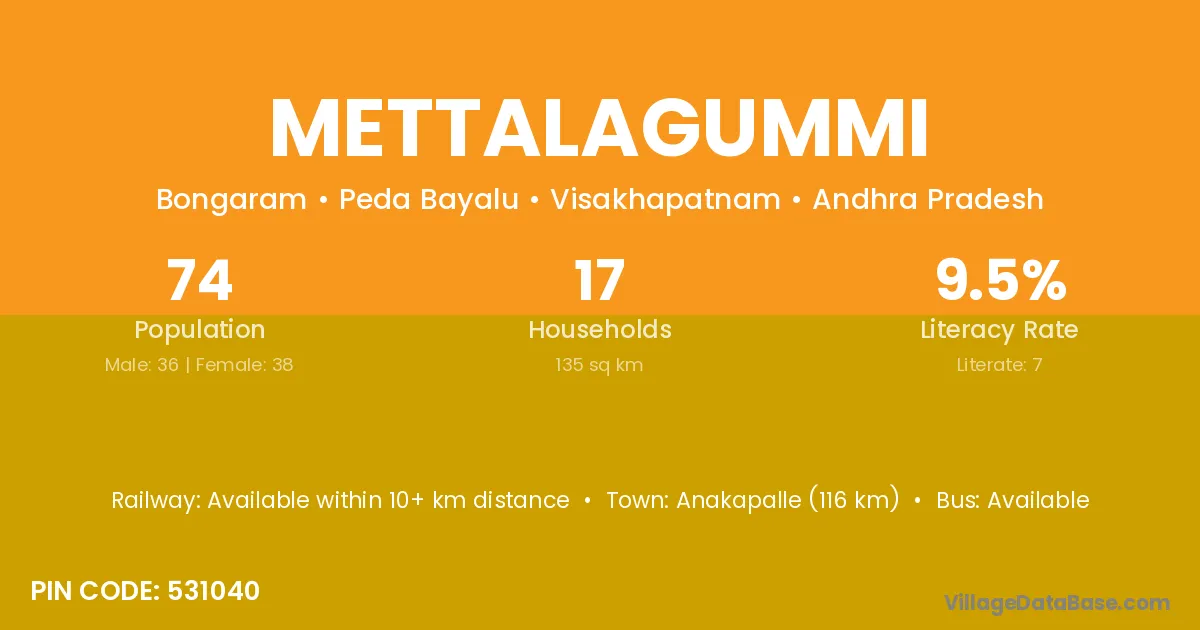 According to Census 2011 information, the village code of Mettalagummi village is 531040.