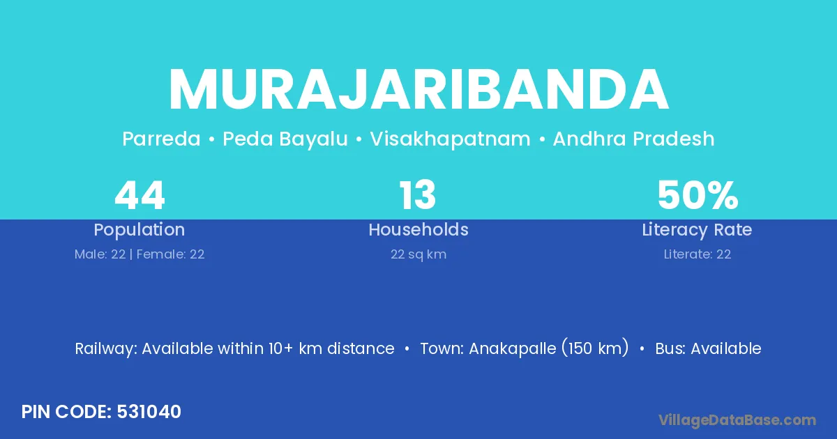 Anakapalle (150 km) is the nearest town to Murajaribanda village for major economic activities and is located approximately 150 km away.