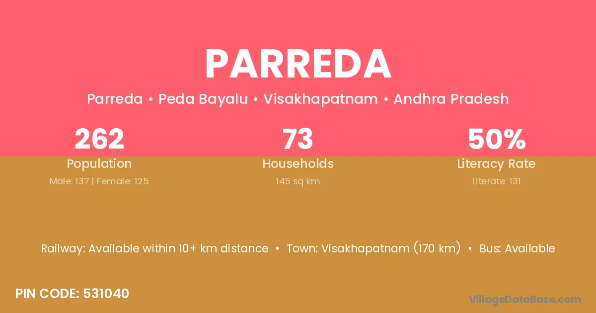 According to Census 2011 information, the village code of Parreda village is 531040.
