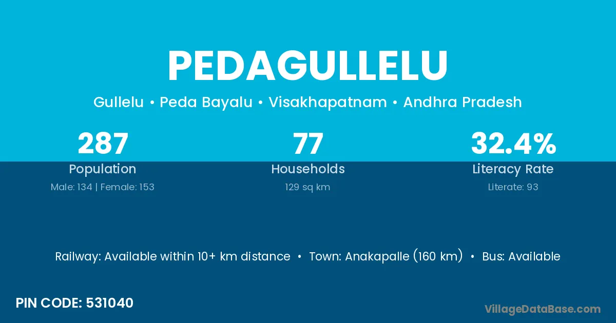 Anakapalle (160 km) is the nearest town to Pedagullelu village for major economic activities and is located approximately 160 km away.