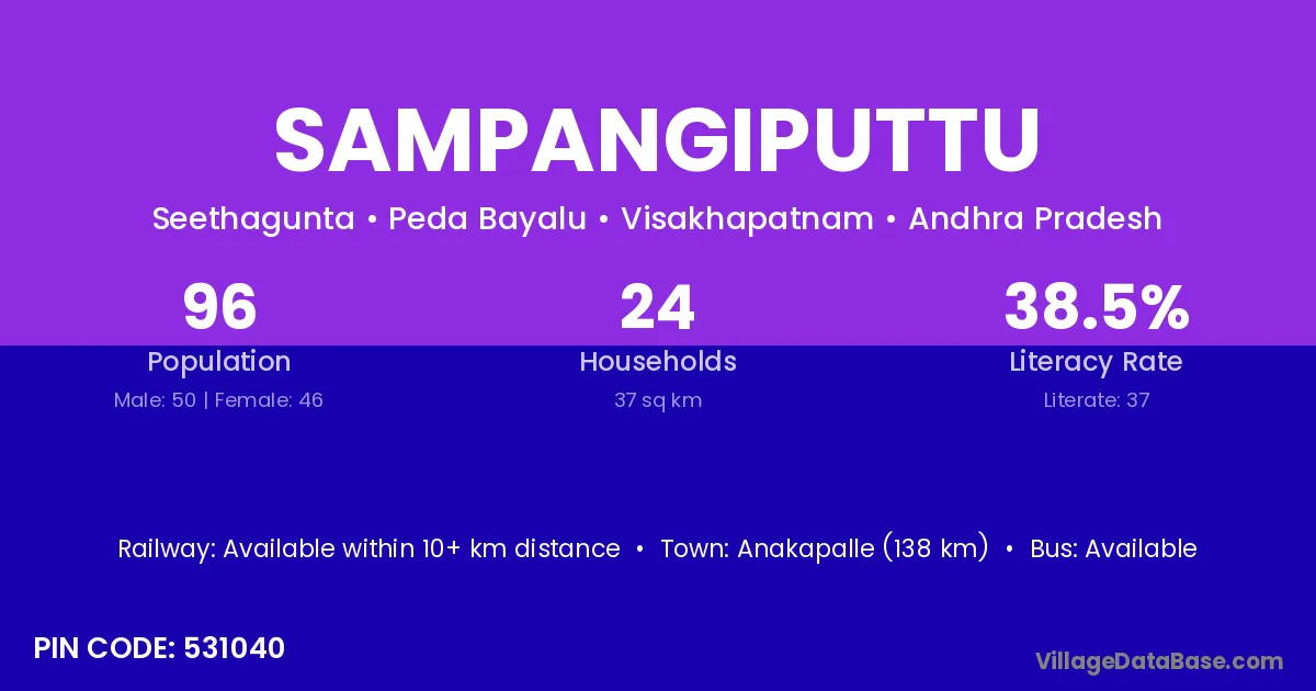 Anakapalle (138 km) is the nearest town to Sampangiputtu village for major economic activities and is located approximately 138 km away.