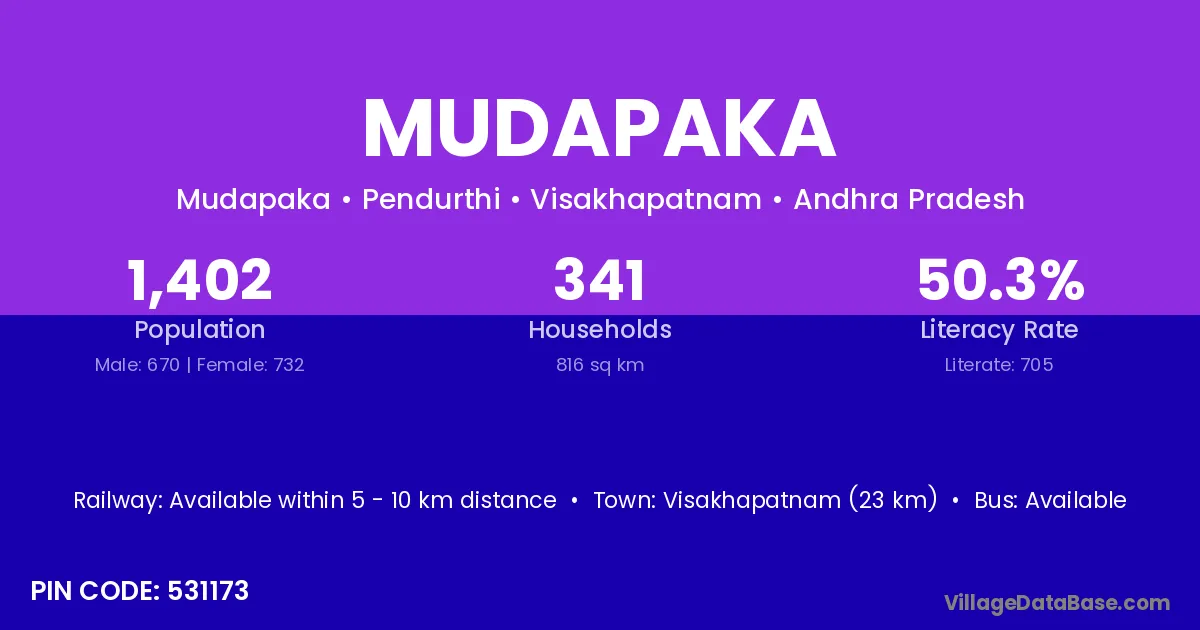 Mudapaka village has a total population of 1,402 people, of which 670 are males and 732 are females.