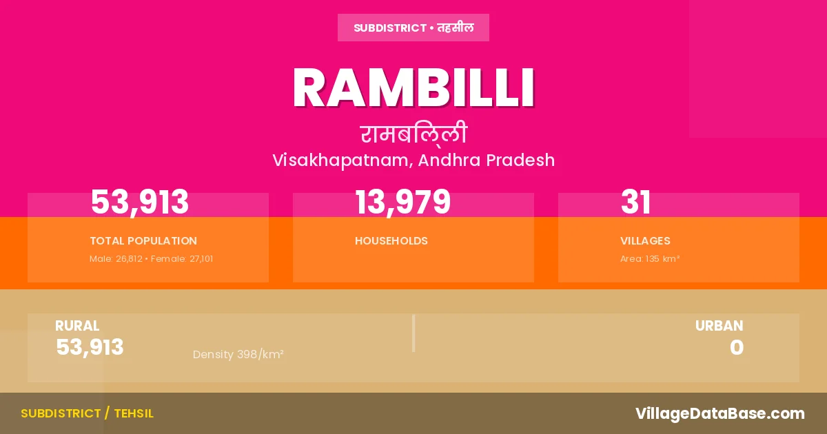 According to the 2011 census The total area of Rambilli Mandal is 135 km², with a population of 53913 people. The population density is 398 inhabitants per square kilometre, and there are approximately 13979 houses in the sub district.