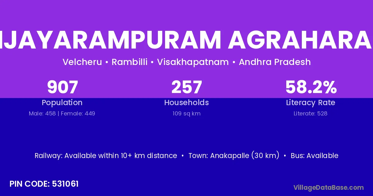 Vijayarampuram Agraharam village has a total population of 907 people, of which 458 are males and 449 are females.