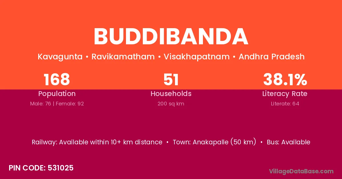 Anakapalle (50 km) is the nearest town to Buddibanda village for major economic activities and is located approximately 50 km away.