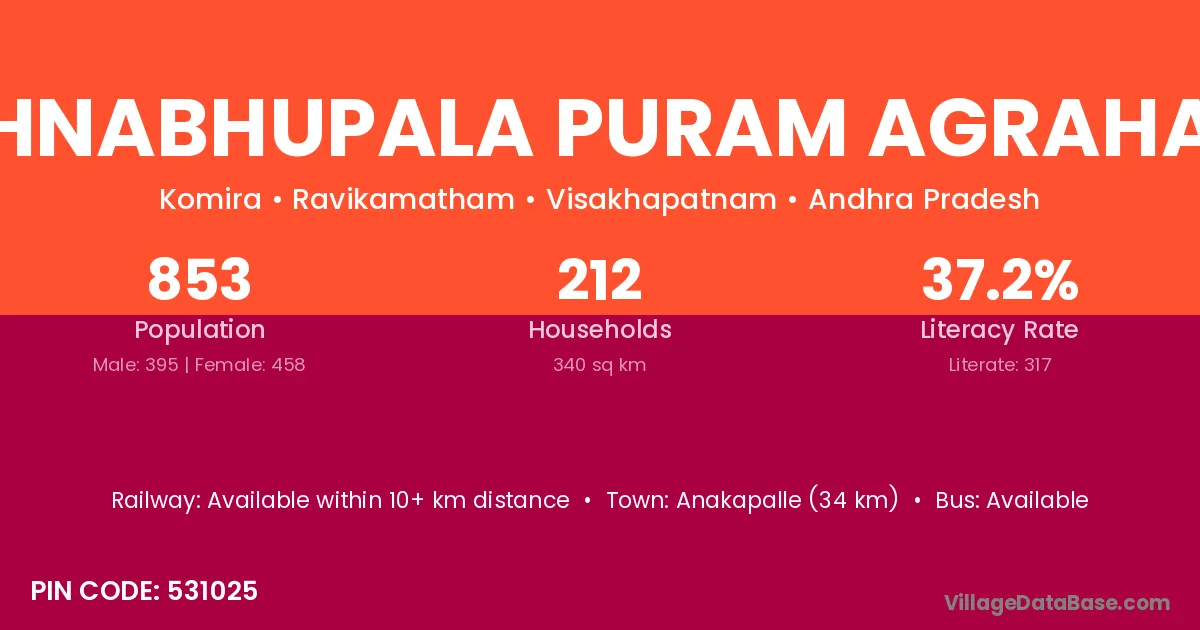 Anakapalle (34 km) is the nearest town to Krishnabhupala Puram Agraharam village for major economic activities and is located approximately 34 km away.