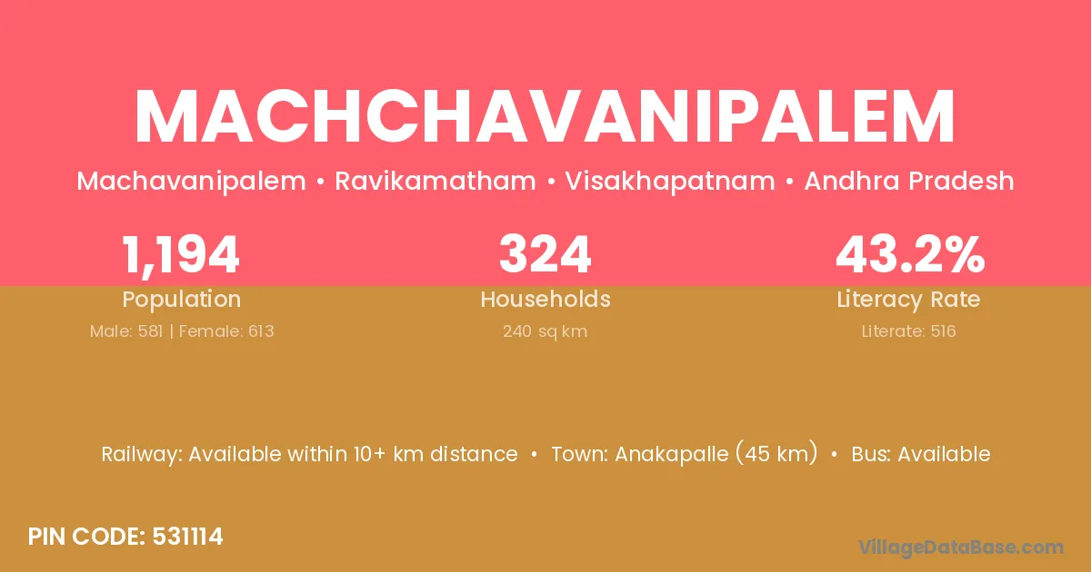 Machchavanipalem village has a total population of 1,194 people, of which 581 are males and 613 are females.