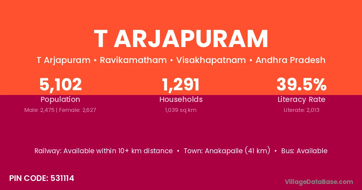 Anakapalle (41 km) is the nearest town to T Arjapuram village for major economic activities and is located approximately 41 km away.
