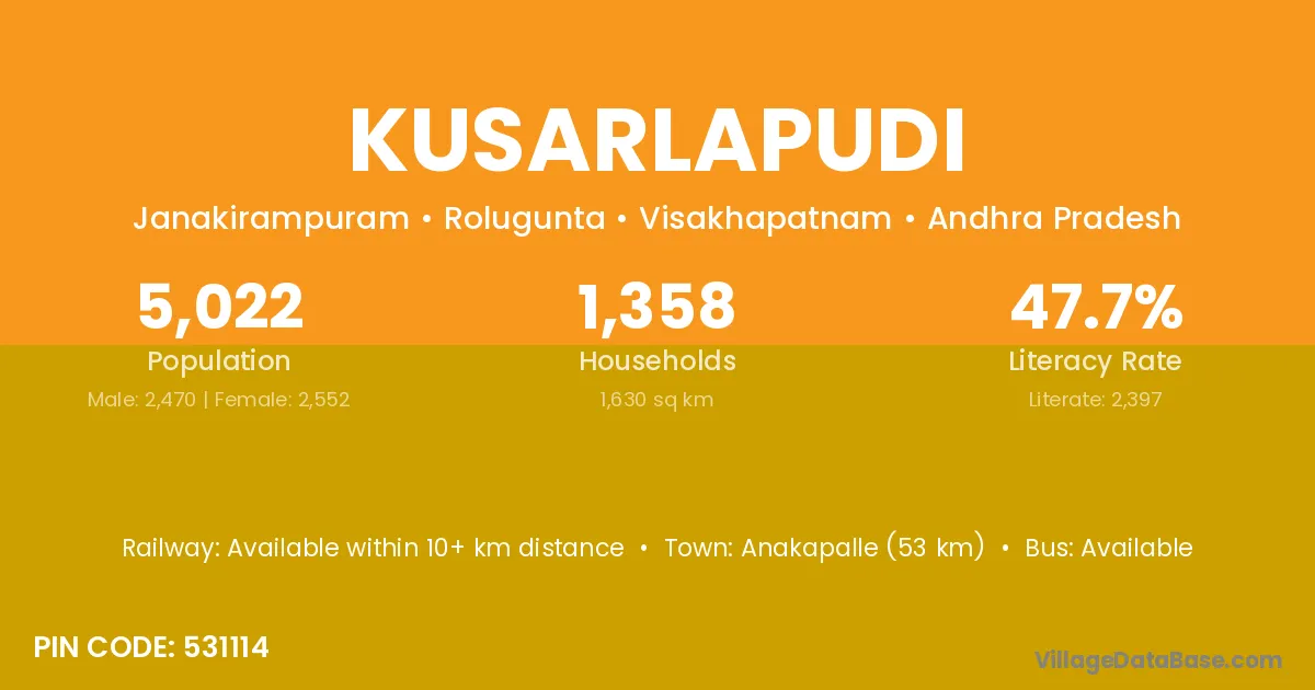 Anakapalle (53 km) is the nearest town to Kusarlapudi village for major economic activities and is located approximately 53 km away.