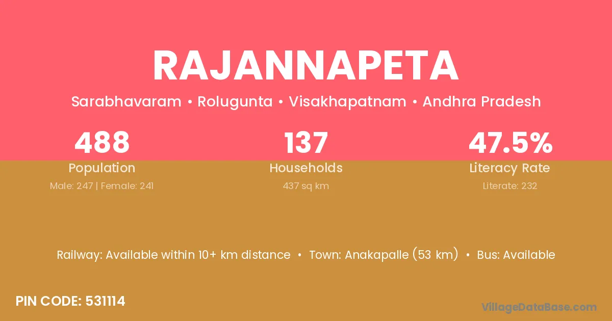 Rajannapeta village has a total population of 488 people, of which 247 are males and 241 are females.
