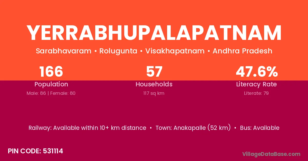 Anakapalle (52 km) is the nearest town to Yerrabhupalapatnam village for major economic activities and is located approximately 52 km away.