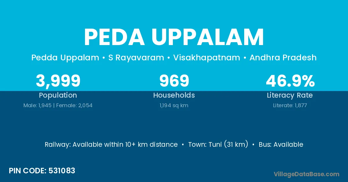 Tuni (31 km) is the nearest town to Peda Uppalam village for major economic activities and is located approximately 31 km away.