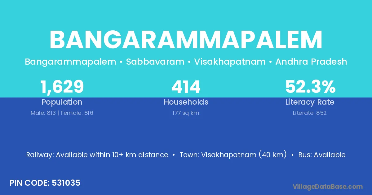 Visakhapatnam (40 km) is the nearest town to Bangarammapalem village for major economic activities and is located approximately 40 km away.