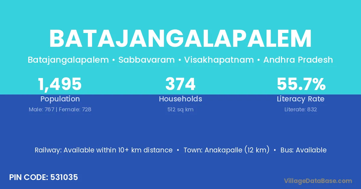 Anakapalle (12 km) is the nearest town to Batajangalapalem village for major economic activities and is located approximately 12 km away.