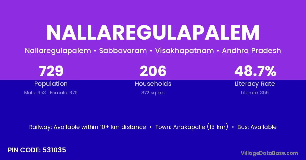 Anakapalle (13 km) is the nearest town to Nallaregulapalem village for major economic activities and is located approximately 13 km away.