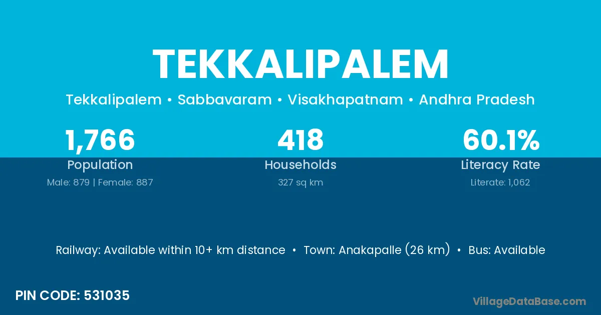 Anakapalle (26 km) is the nearest town to Tekkalipalem village for major economic activities and is located approximately 26 km away.