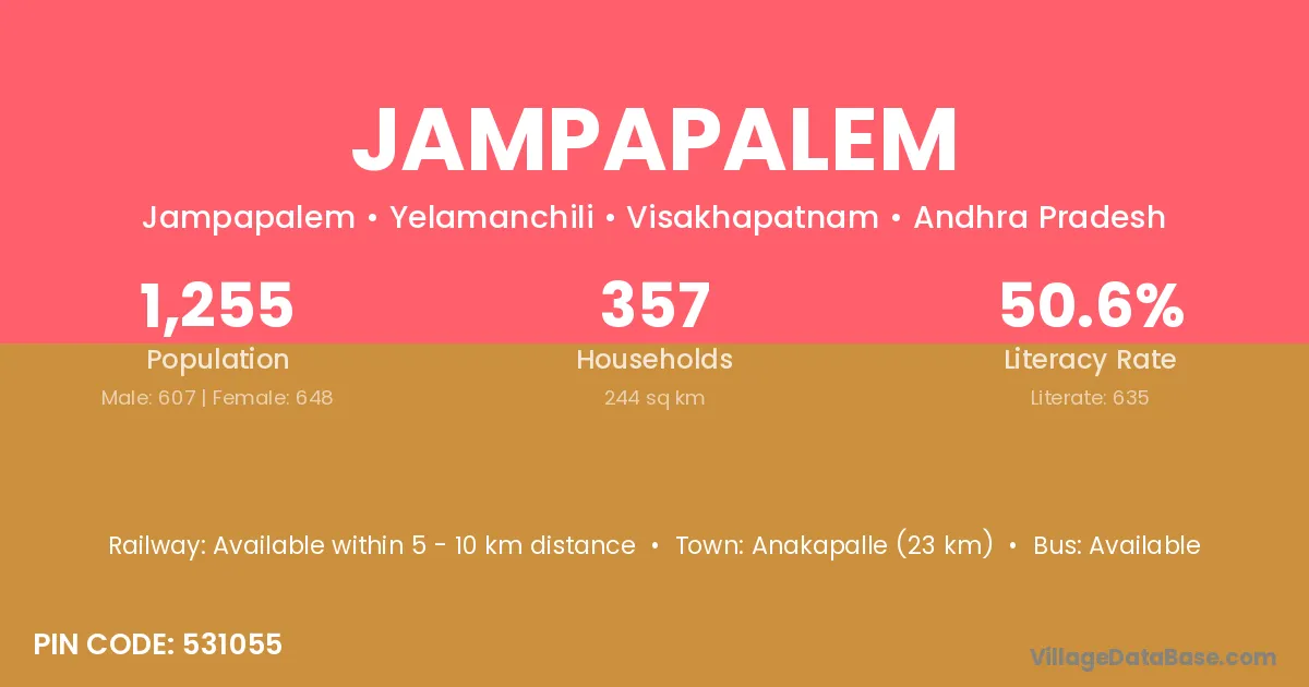 Jampapalem village has a total population of 1,255 people, of which 607 are males and 648 are females.