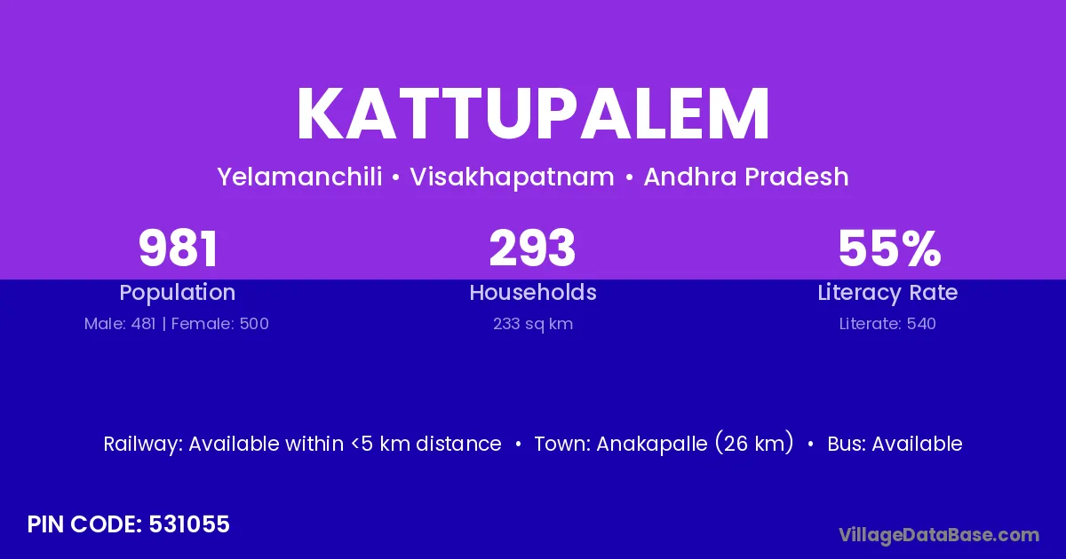 Anakapalle (26 km) is the nearest town to Kattupalem village for major economic activities and is located approximately 26 km away.