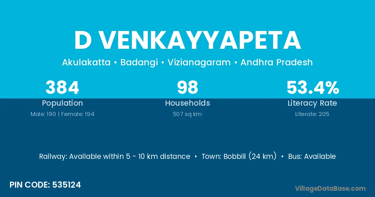 Bobbili (24 km) is the nearest town to D Venkayyapeta village for major economic activities and is located approximately 24 km away.