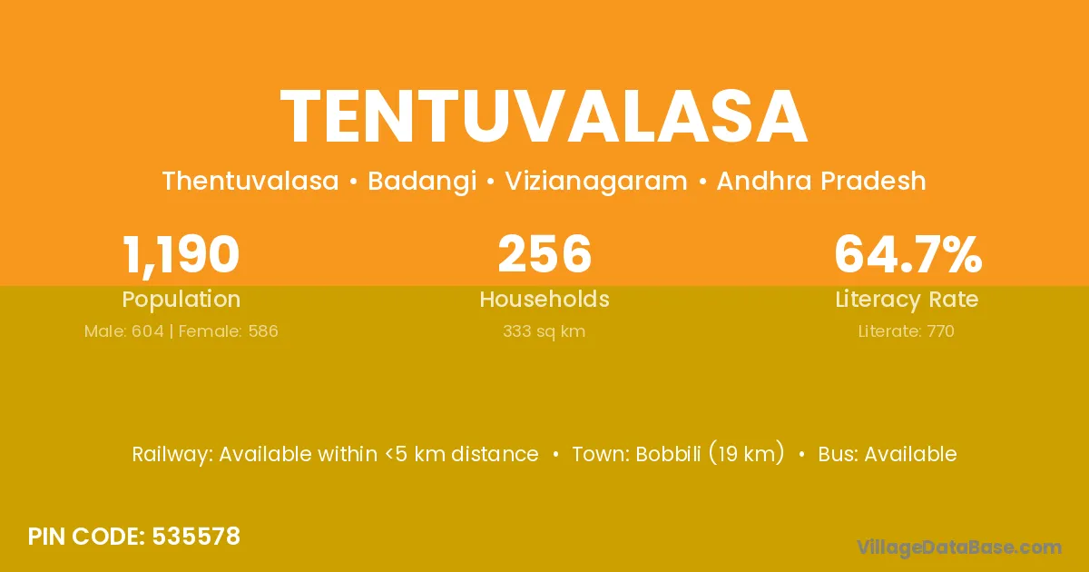 Bobbili (19 km) is the nearest town to Tentuvalasa village for major economic activities and is located approximately 19 km away.