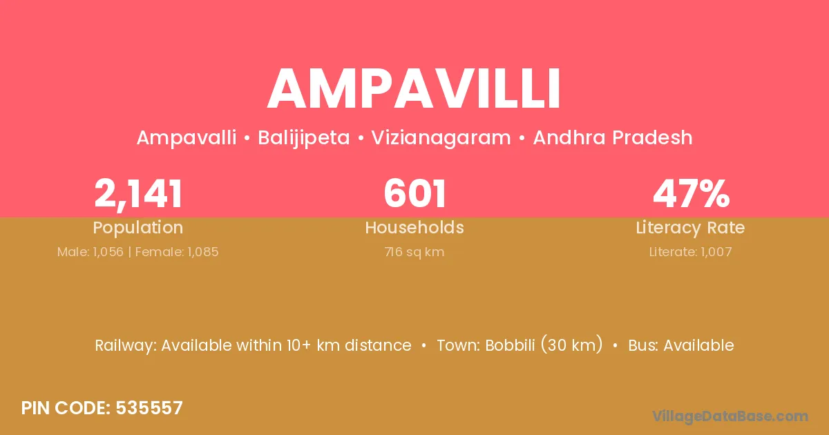 Bobbili (30 km) is the nearest town to Ampavilli village for major economic activities and is located approximately 30 km away.