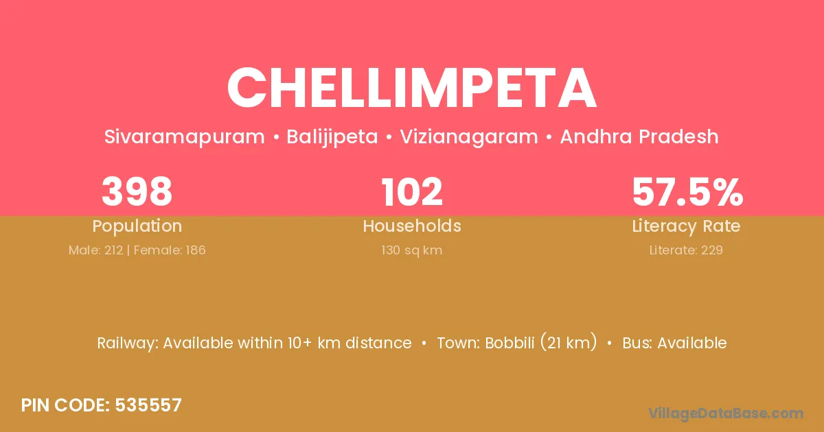 Bobbili (21 km) is the nearest town to Chellimpeta village for major economic activities and is located approximately 21 km away.