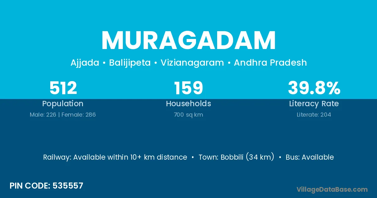 Bobbili (34 km) is the nearest town to Muragadam village for major economic activities and is located approximately 34 km away.