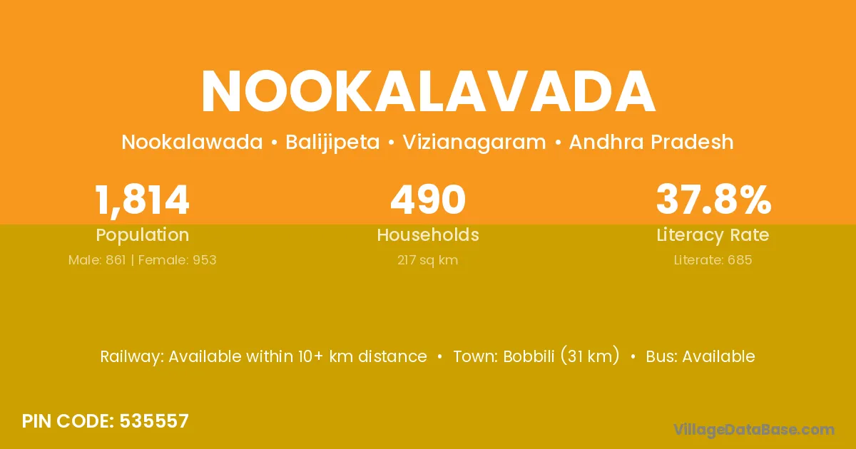 Bobbili (31 km) is the nearest town to Nookalavada village for major economic activities and is located approximately 31 km away.