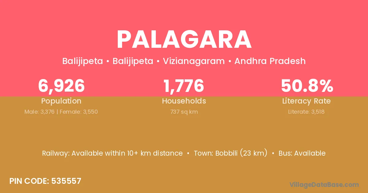Bobbili (23 km) is the nearest town to Palagara village for major economic activities and is located approximately 23 km away.