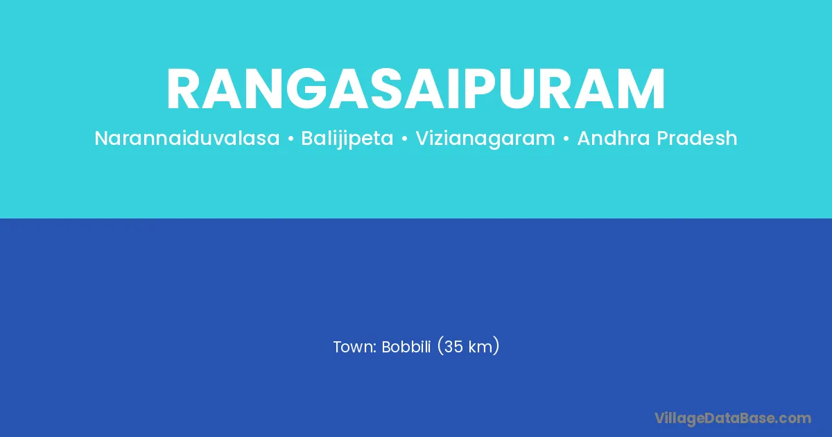 Bobbili (35 km) is the nearest town to Rangasaipuram village for major economic activities and is located approximately 35 km away.