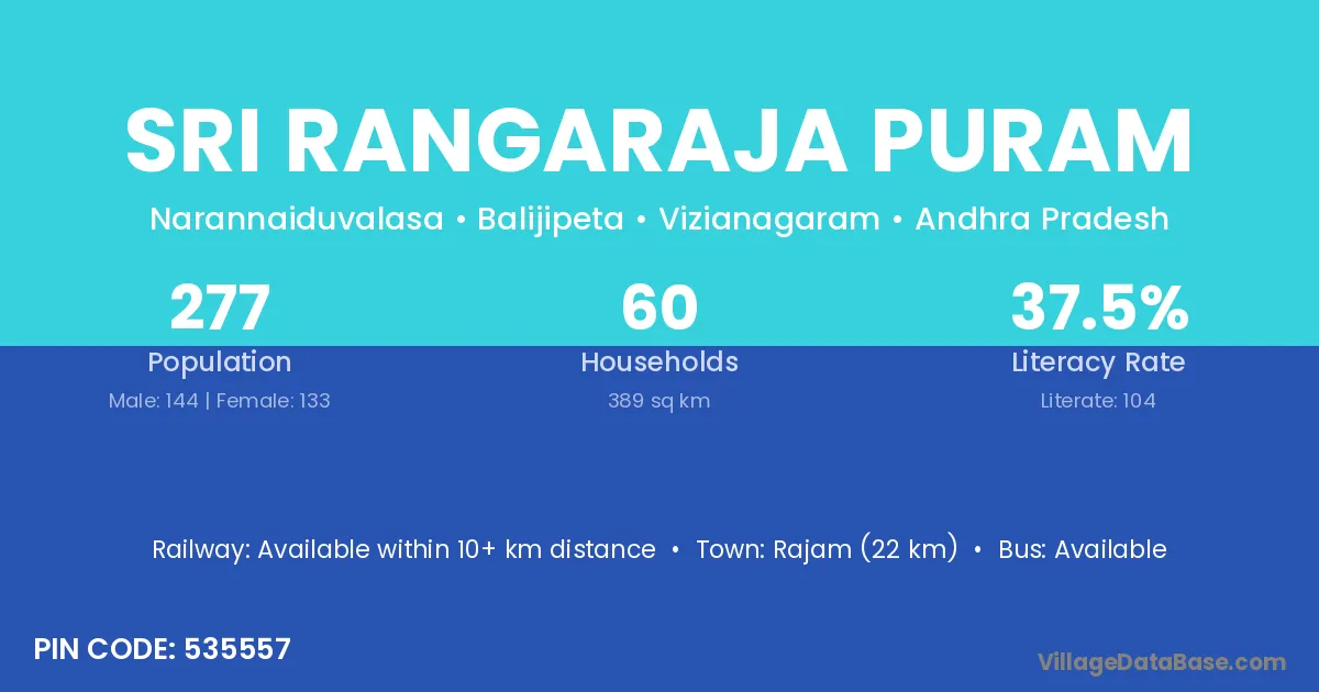 Rajam (22 km) is the nearest town to Sri Rangaraja Puram village for major economic activities and is located approximately 22 km away.