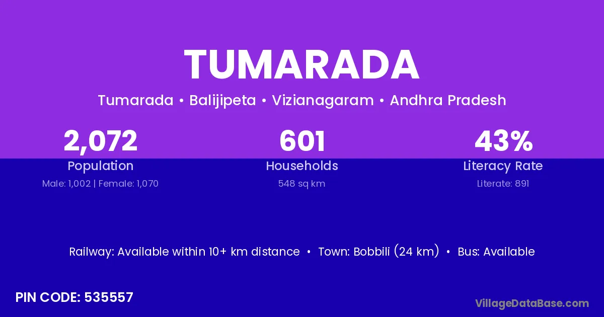 Bobbili (24 km) is the nearest town to Tumarada village for major economic activities and is located approximately 24 km away.