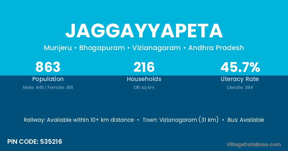 Jaggayyapeta village has a total population of 863 people, of which 445 are males and 418 are females.