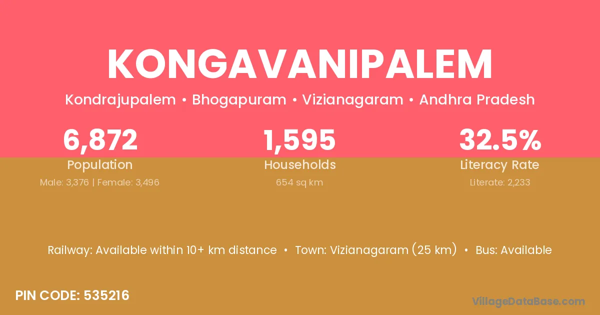 Vizianagaram (25 km) is the nearest town to Kongavanipalem village for major economic activities and is located approximately 25 km away.