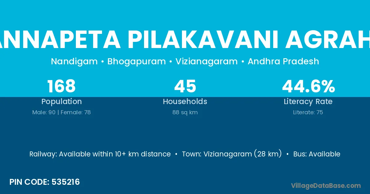 Subbannapeta Pilakavani Agraharam village has a total population of 168 people, of which 90 are males and 78 are females.