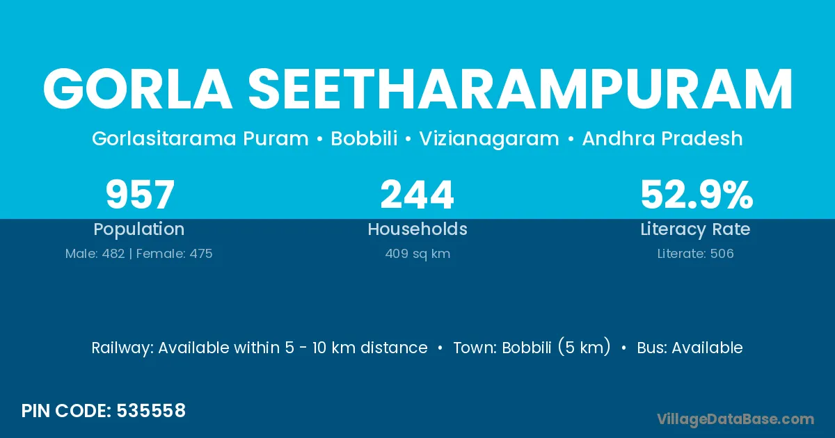 Bobbili (5 km) is the nearest town to Gorla Seetharampuram village for major economic activities and is located approximately 5 km away.