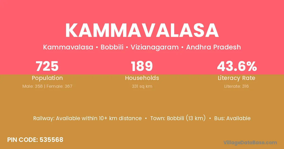 The literacy rate of Kammavalasa village is 43.59%. Male literacy stands at 55.03% and female literacy at 32.43%.