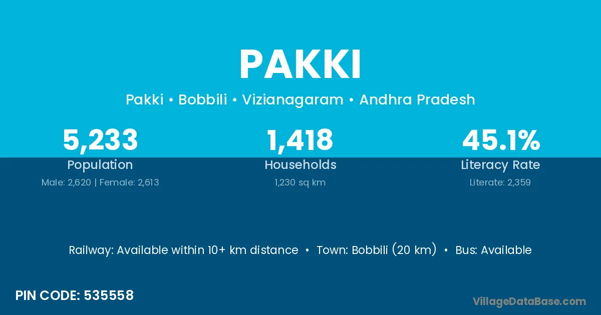 Bobbili (20 km) is the nearest town to Pakki village for major economic activities and is located approximately 20 km away.