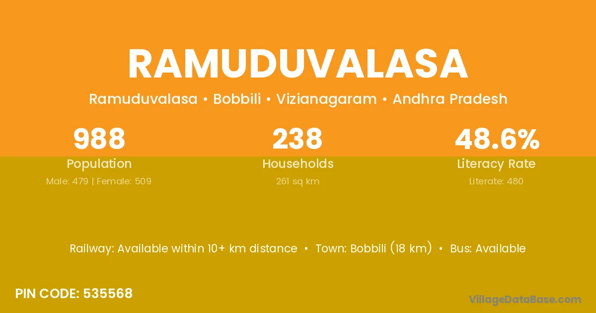 Bobbili (18 km) is the nearest town to Ramuduvalasa village for major economic activities and is located approximately 18 km away.