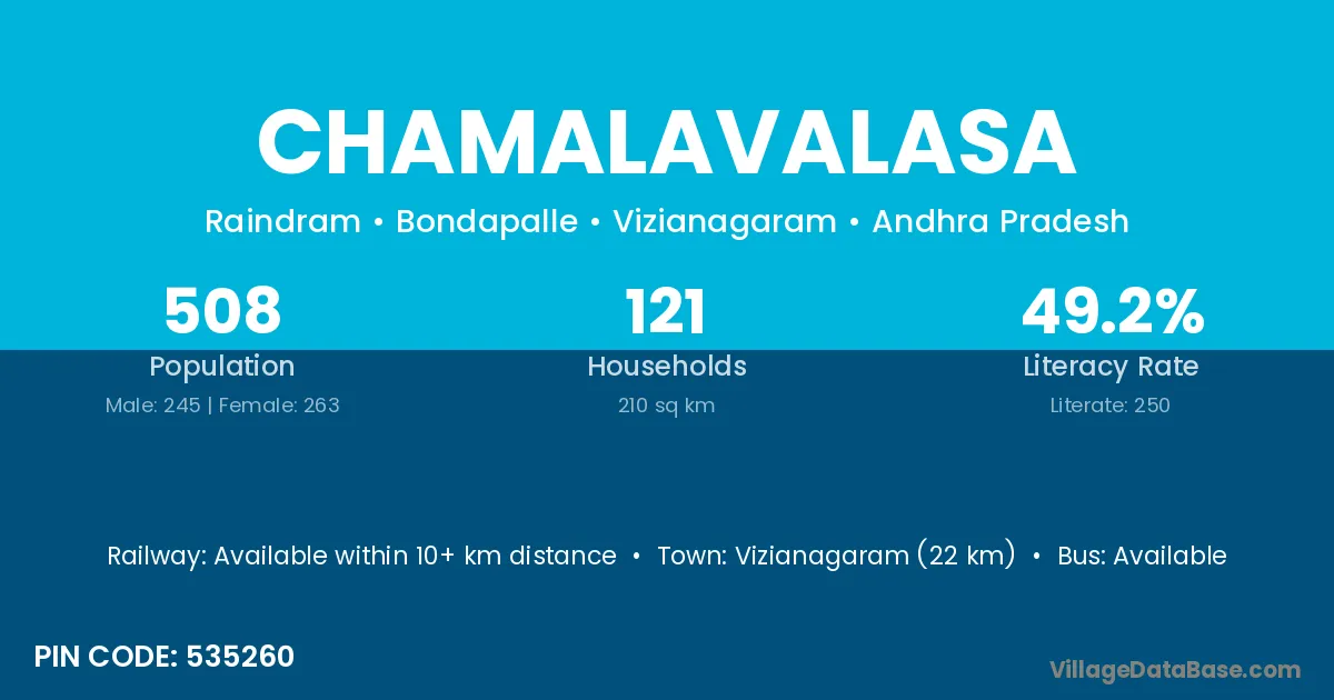 Chamalavalasa village has a total population of 508 people, of which 245 are males and 263 are females.