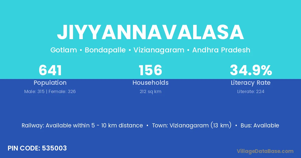 Jiyyannavalasa village has a total population of 641 people, of which 315 are males and 326 are females.