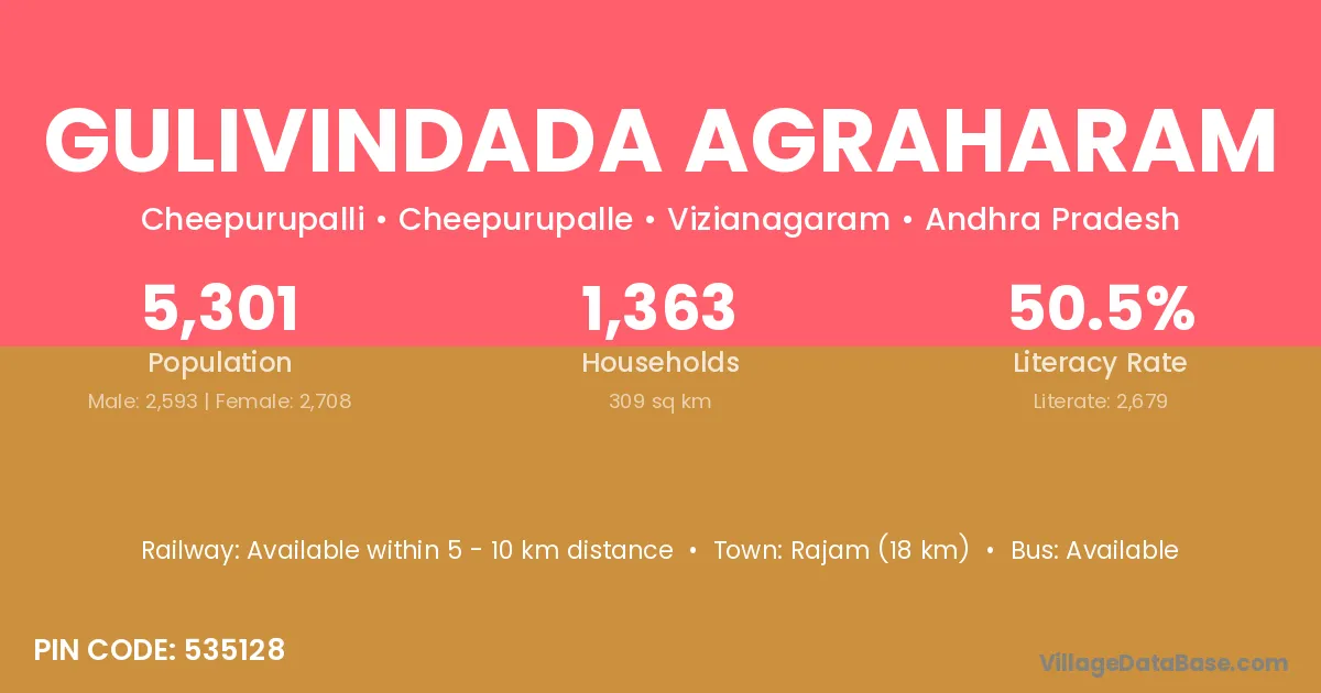 Gulivindada Agraharam village has a total population of 5,301 people, of which 2,593 are males and 2,708 are females.