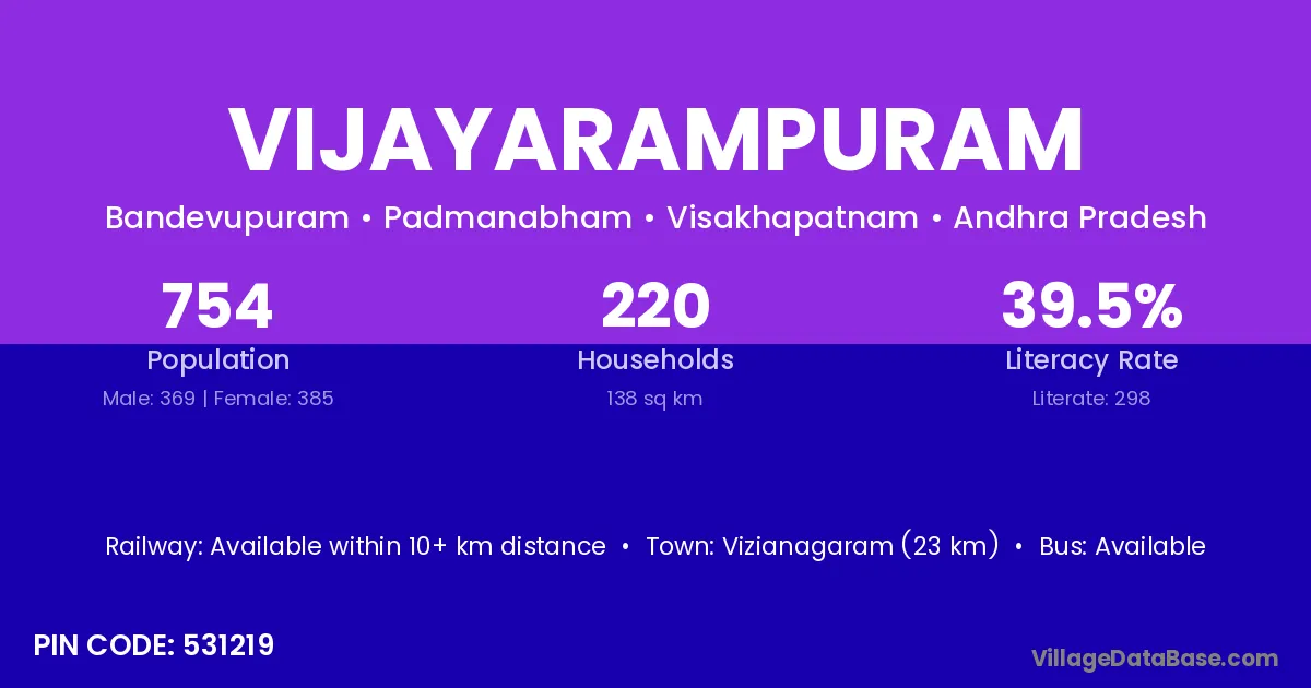 Rajam (22 km) is the nearest town to Vijayarampuram village for major economic activities and is located approximately 22 km away.
