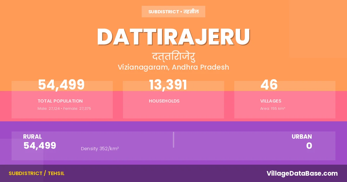 According to the 2011 census The total area of Dattirajeru Mandal is 155 km², with a population of 54499 people. The population density is 352 inhabitants per square kilometre, and there are approximately 13391 houses in the sub district.