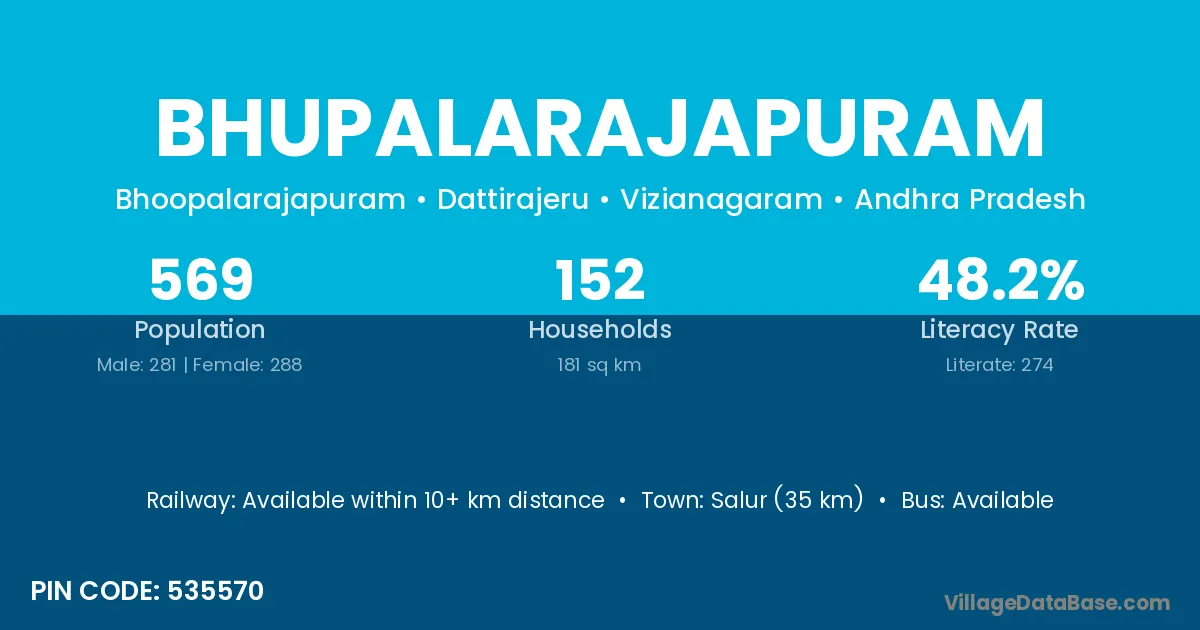 Salur (35 km) is the nearest town to Bhupalarajapuram village for major economic activities and is located approximately 35 km away.